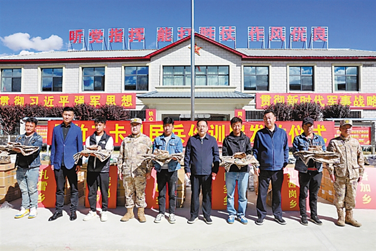 近日,拉萨市墨竹工卡县举行民兵作训服发放仪式。此次共计发放作训服665套,主要发放给墨竹工卡县8个乡镇以及县人民医院、西藏华泰龙矿业有限公司下属民兵,每套包含帽子、肩章、胸标等物品。 图为仪式现场,相关领导为民兵代表发放民兵作训服。 本报记者 格桑伦珠 摄