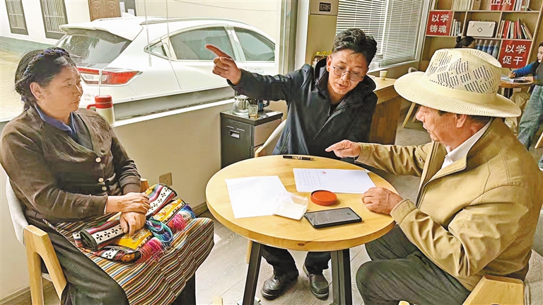 近日,墨竹工卡县工卡镇工卡村驻村工作队,协助村“两委”成功调解一起矛盾纠纷,促成双方达成一致意见并签订承诺书。 图为驻村工作队队员在调解纠纷。 本报记者 索朗旺久 摄