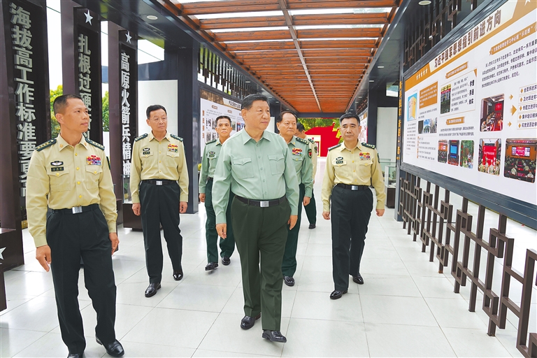 金秋十月,江淮大地山水秀丽、风景如画。上午11时许,习近平来到火箭军某旅,首先察看了该旅军史长廊。该旅是一支有着50多年光荣历史的战略导弹部队。党的十八大以来,该旅在习近平强军思想指引下,坚定举旗铸魂,大抓实战化训练,出色完成一系列重大任务。在反映部队发展历程、新时代全面建设的展板前,习近平详细了解官兵学习党的创新理论、加紧练兵备战、弘扬优良传统等情况。