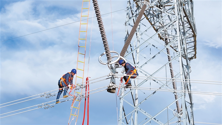 为确保西藏电网安全稳定运行,近日,国网西藏超高压分公司开展了柴拉直流年度检修工作,旨在强化电力运维保障能力,全面治理电网设备缺陷隐患,提升设备运行水平。下一步,国网西藏超高压分公司将继续做好设备运维管理工作,增强柴拉直流外送可靠性,助力清洁能源外送,为西藏经济发展提供保障。 图为工作人员在那曲市色尼区罗玛镇±400千伏柴拉直流#1889杆塔开展绝缘护套安装工作。本报记者 刘倩茹 摄