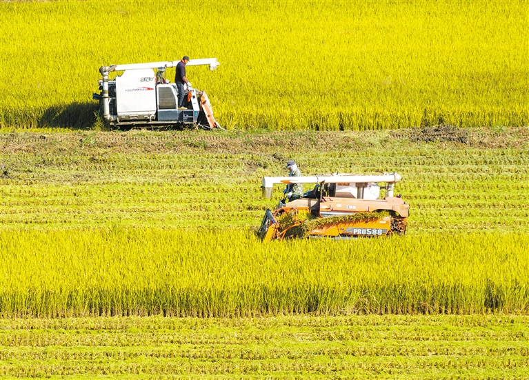 金秋十月,各地农户抢抓农时,进行秋种、秋收以及各项田间管理工作,到处一派农事繁忙的景象。 图为10月20日,在江苏省兴化市陈堡镇里堡村,农机手驾驶收割机收割水稻(无人机照片)。 新华社发