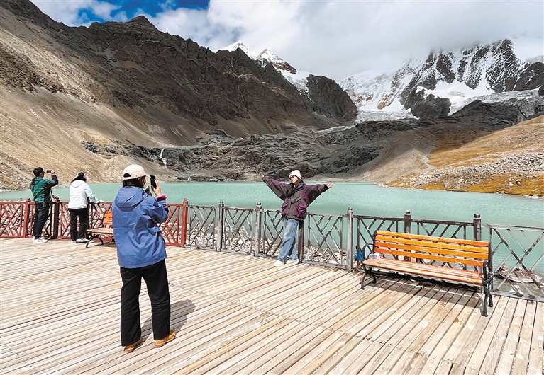 图为游客在尼木县琼穆岗嘎雪山景区合影留念。本报记者 旦增兰泽 摄