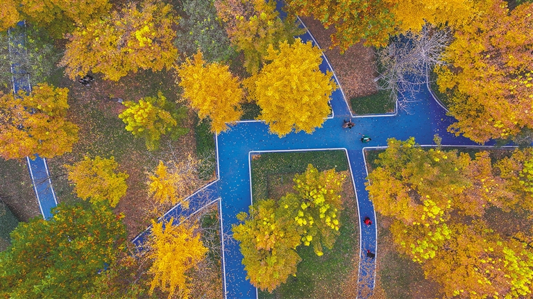 河北 图为10月31日,市民在河北省遵化市人民公园赏景游玩(无人机照片)。新华社发(刘满仓 摄)