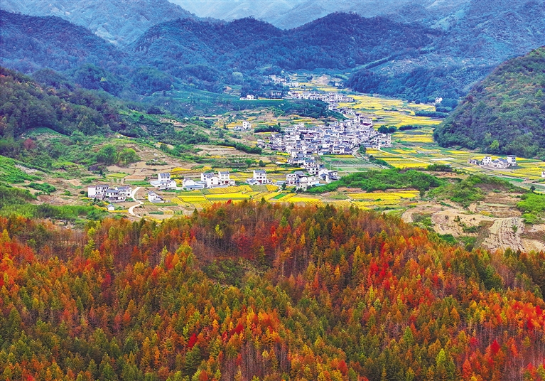安徽 图为10月31日在安徽省黄山市歙县溪头镇西坡村拍摄的乡村秋色(无人机照片)。新华社发(施亚磊 摄)