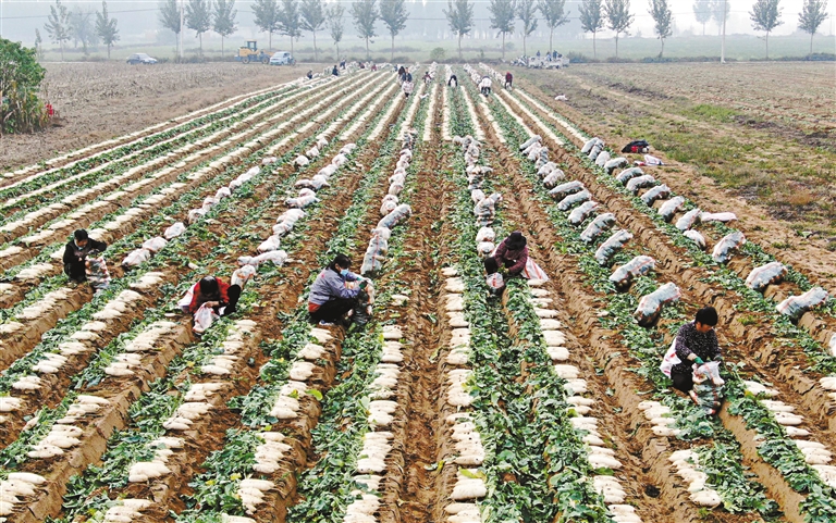 ?图为11月3日,河北省石家庄新乐市正莫镇正莫村农民在收获白萝卜(无人机照片)。 新华社发(贾敏杰 摄)