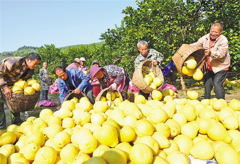 ?图为11月2日,在广西融水苗族自治县梧村,果农把刚采摘的糯米柚集中堆放。 新华社发(龙涛 摄)