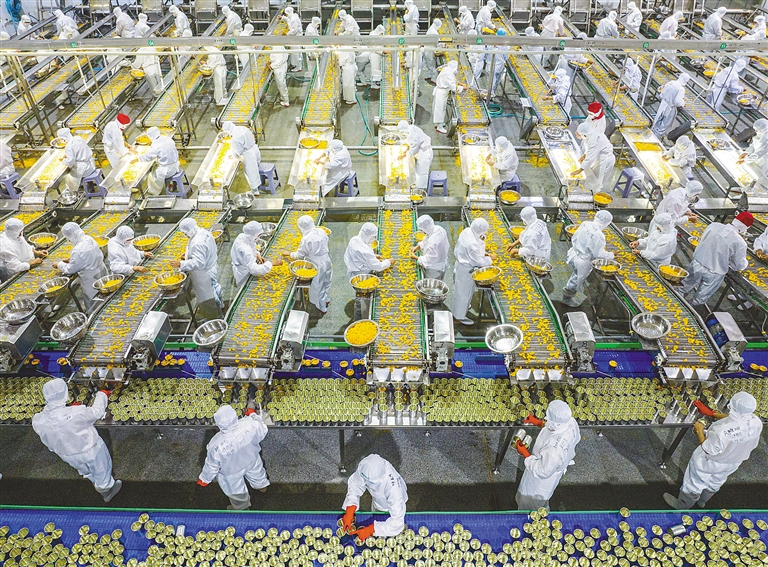 图为11月2日,工人在湖北省宜昌市秭归县屈姑国际农业集团柑橘加工车间生产线上制作柑橘罐头(无人机照片)。