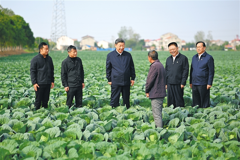 5日上午,习近平前往咸宁市嘉鱼县,首先到潘家湾镇十里蔬菜长廊考察。深秋时节,这里仍然满目青翠、生机勃勃。习近平走进田间,察看蔬菜长势,详细询问蔬菜品种、种植技术、销售等情况。他强调,农村天地广阔,农业大有可为。发展现代农业,建设农业强国,必须依靠科技进步,让科技为农业现代化插上腾飞的翅膀。他勉励当地干部群众走科技之路、质量之路、品牌之路,把蔬菜种植这个富民产业进一步做好,让更多群众增收致富。