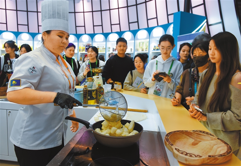 图为11月6日,参会者在第七届进博会食品及农产品展区哈萨克斯坦商品馆等待品尝使用哈萨克斯坦面粉和食用油炸制的小吃。