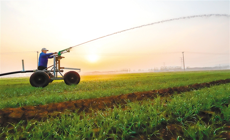 图为河北省遵化市东新庄镇农民在麦田浇防冻水。