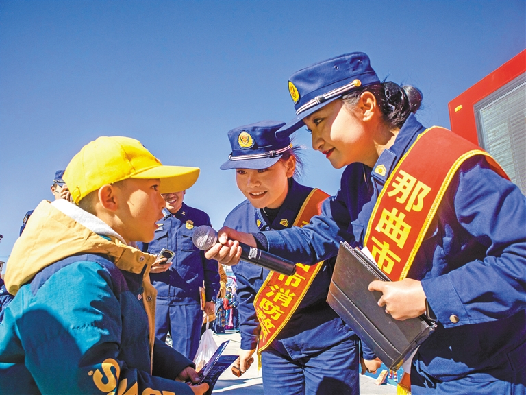 图③:那曲市2024年消防宣传月启动仪式现场,小朋友参与消防知识问答。