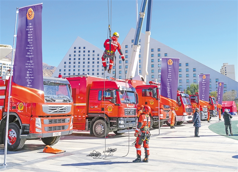 图①:西藏·拉萨“119”消防宣传月启动仪式现场,消防员展示消防救援技能。