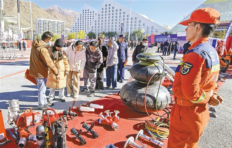 图②:西藏·拉萨“119”消防宣传月启动仪式现场,市民观看消防设备。