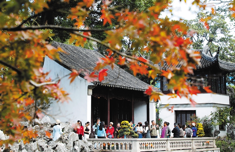 江苏:图为11月14日,游客在江苏苏州狮子林赏景游玩。新华社发(杭兴微 摄)