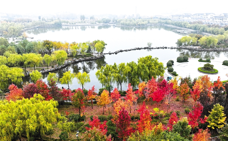 山东:图为11月14日拍摄的山东枣庄山亭区紫云湖公园初冬景色(无人机照片)。新华社发(李宗宪 摄)