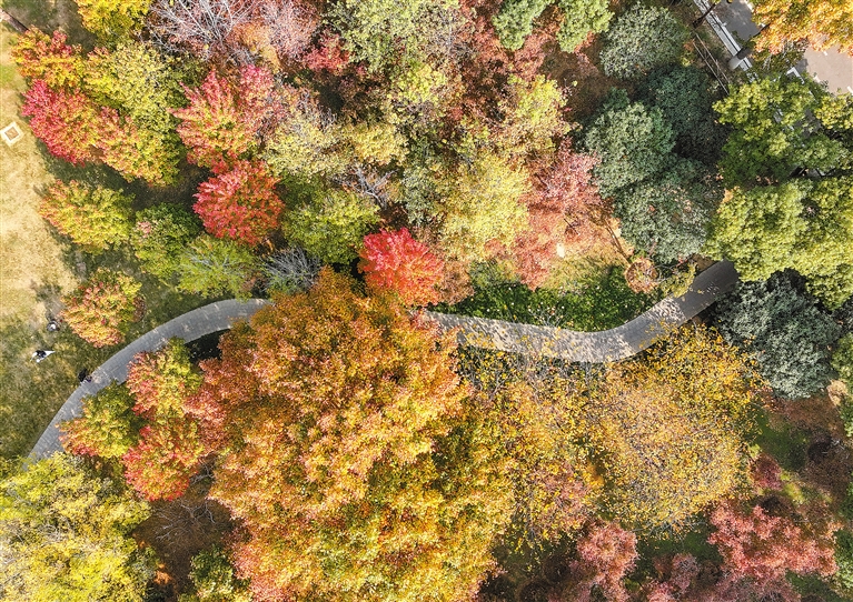 湖北: 图为11月14日,游人在湖北省武汉市东湖风景区游览(无人机照片)。新华社发(赵军 摄)