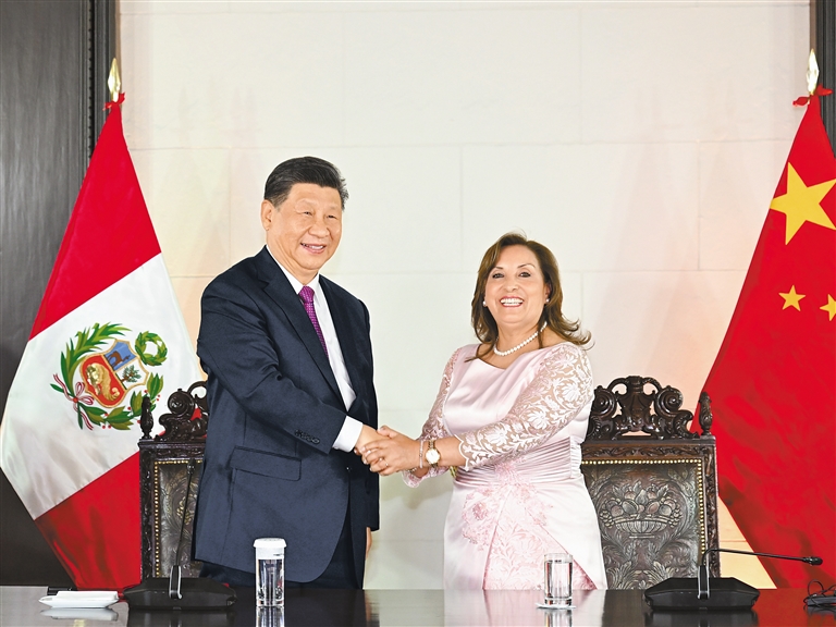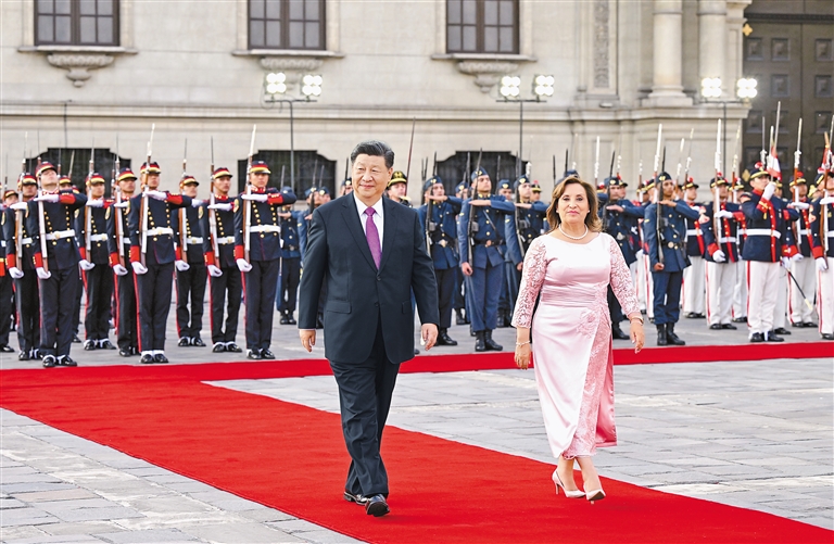 习近平指出,双方要对接发展战略,深挖合作潜力,打造务实合作新格局,加强贸易和投资“双轮驱动”,推动传统产业和新兴产业“两翼齐飞”,促进产业链和供应链“两链融通”。中方愿继续扩大进口秘鲁特色优质农产品,鼓励有实力的中国企业赴秘鲁投资兴业,为当地发展作出应有贡献。双方要统筹推进矿产能源、基础设施、交通通信等传统领域合作,拓展数字经济、人工智能、绿色航运、电动汽车、光伏产业等新兴领域合作。中方愿鼓励中国企业参与秘鲁基础设施建设“硬联通”,推动智慧海关“软联通”。中国企业克服困难如期完成钱凯港项目一期工程,充分表明中方同秘方开展长期战略合作的决心。中方愿同秘方一道,充分发挥钱凯港区位优势,打造以钱凯港为起点的中拉陆海新通道,探索构建从沿海到内陆、从秘鲁到拉美其他国家的立体、多元、高效互联互通格局,带动拉美和加勒比地区整体发展和一体化建设。(下转第二版)(紧接第一版) 中方支持苏州市同钱凯市建立友城关系,愿同秘方开展工业园区建设经验交流,拓展跨境服务贸易、电子商务等领域合作,发挥集群效应和联动效应,用更多务实成果坚定中秘长期友好互利合作的信心。中方也愿结合秘方发展需求,就近设立鲁班工坊、中文工坊,开展职业教育合作,为秘方提供本土化人才和智力技术支撑。