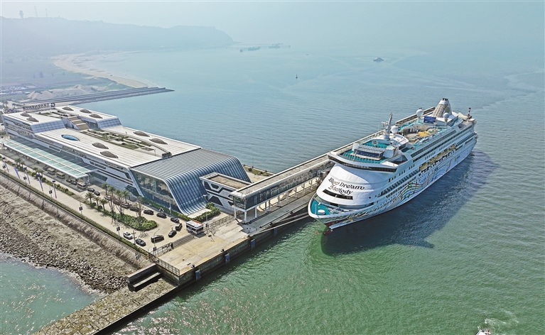 这是在北部湾国际邮轮母港拍摄的即将执行首航任务的“蓝梦之歌”号邮轮(11月15日摄,无人机照片)。