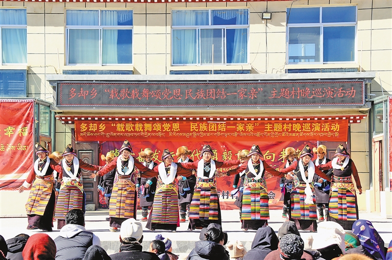 文艺是时代前进的号角,最能代表一个时代的风貌,最能引领一个时代的风气。连日来,来自浪卡子县多却乡的12支行政村文艺演出队,利用3天时间深入3个村(居),开展了以“载歌载舞颂党恩 民族团结一家亲”为主题的文艺巡演。巡演活动中,一个个沾泥土、带露珠的文艺节目深情表达了羊卓儿女听党话、感党恩、跟党走的坚定信念。