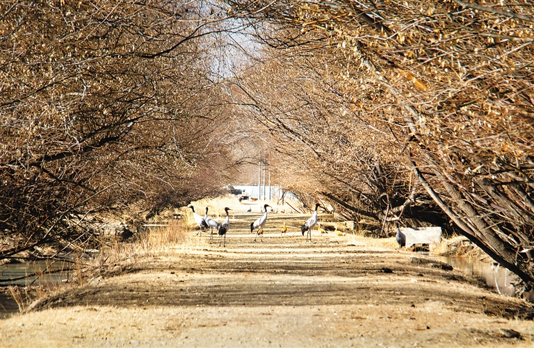 位于雅鲁藏布江与年楚河交汇处的日喀则市桑珠孜区边雄乡,是黑颈鹤的越冬地之一。这里有广袤的农田和湿地,黑颈鹤可在此觅食、过冬。
