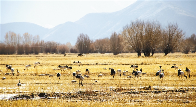 图为黑颈鹤在觅食。本报记者 旦增嘎瓦 摄