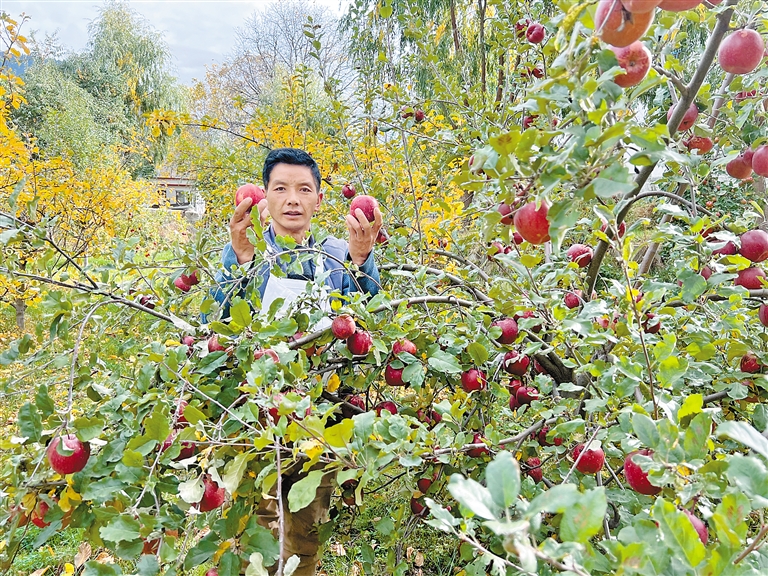图为米林市里龙乡甲帮村村民在自家庭院采摘苹果。 本报记者 王珊 本报通讯员 次仁占堆 摄