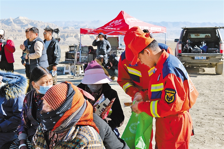 图③:札达县消防救援大队指战员在古格声声音乐会执勤点开展消防宣传活动。