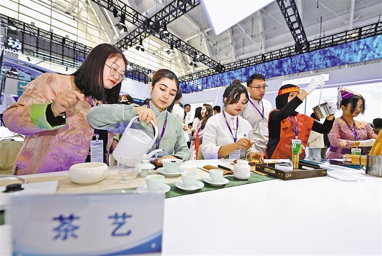 上图:11月21日,参会者在职业教育专题展上展示茶艺。新华社记者 赵子硕 摄