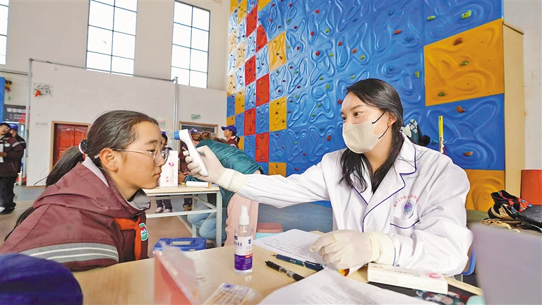 接种疫苗后,医生在留观区为学生测量体温。 本报记者 格桑伦珠 摄