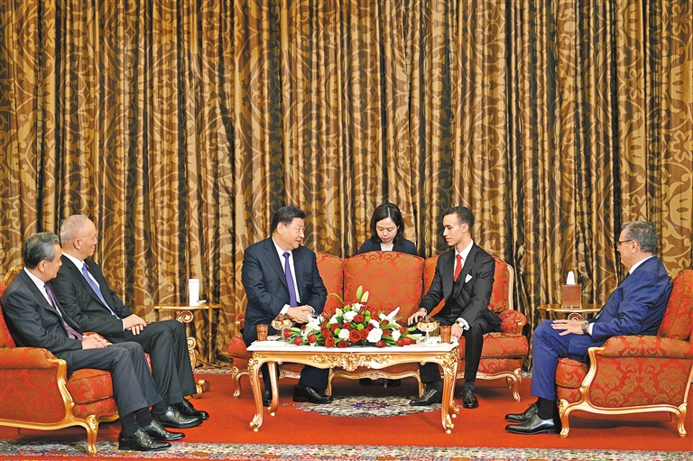 习近平请哈桑王储转达对穆罕默德六世国王的亲切问候和良好祝愿。习近平指出,中摩两国关系发展良好,双方务实合作富有成效,各领域交往日益活跃。2016年,穆罕默德六世国王对中国进行国事访问,我同他举行了富有成果的会谈,推动中摩关系迈上新台阶。中方支持摩洛哥维护国家安全稳定,愿同摩方继续在涉及彼此核心利益问题上坚定相互支持。中方愿同摩方落实好中非合作论坛北京峰会和中阿合作论坛第十届部长级会议成果,推动共建“一带一路”框架内各领域务实合作取得更多成果。双方要扩大人文交流,夯实两国友好民意基础,推动中摩战略伙伴关系得到更大发展。