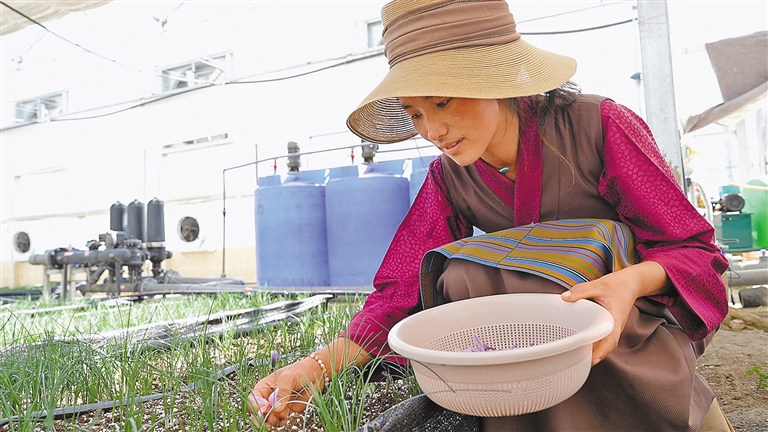 左图:工作人员在采摘藏红花。本报记者 索朗旺久 本报通讯员 次旺伦珠 摄