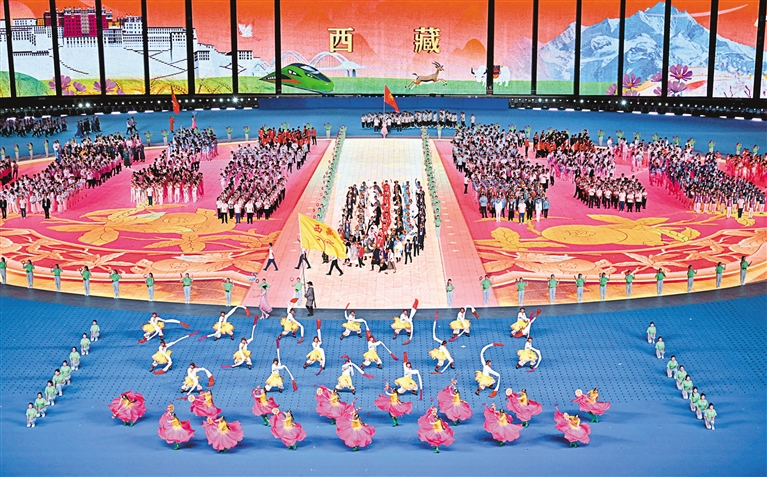配图:第十二届全国少数民族传统体育运动会开幕式上,西藏自治区代表团入场。 新华社记者 郭程 摄