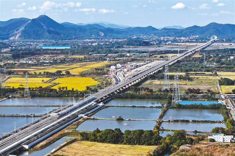 图为11月23日,沪苏湖高铁首趟试运行列车G55505次行驶在湖州境内(无人机照片)。新华社发(何伟卫 摄)