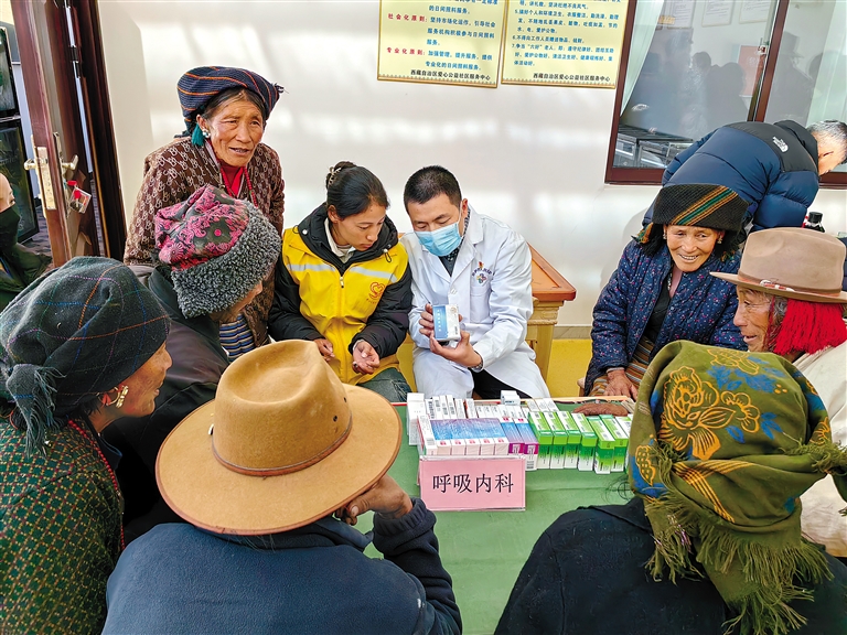 近日,中共拉萨市发展和改革委员会机关委员会组织拉萨市人民医院北京援藏医疗团队赴林周县热振寺、阿郎乡拉康村开展义诊巡诊、送医送药、会诊答疑、健康科普等系列医疗活动。 图为义诊现场。本报记者 刘琳琳 摄