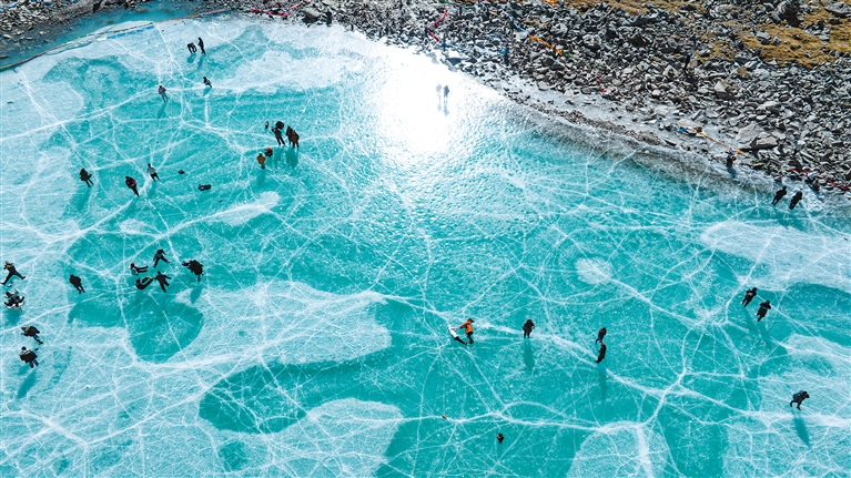 图为游客在琼穆岗嘎峰前的冰湖上游玩。(无人机照片)