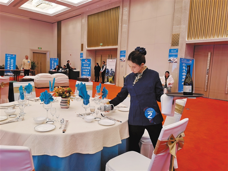 图为餐厅服务比赛现场,选手正在以规范动作进行摆盘(杯)、桌花、倒酒等环节比赛。本报记者 孙开远 摄