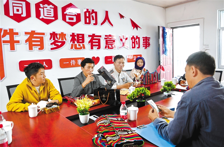那曲市安多县的大学毕业生仓秋多吉联合6人创业,于2021年创办了安多托尕尔仓游牧产业有限责任公司。公司搭建了民族手工艺产品、土特产销售平台,在当地政府优化营商环境政策的支持下,创业团队逐步扩大,带动了当地农牧民产业兴旺。 图为仓秋多吉(左二)和团队核心成员商讨产品销售提升策略。(资料图片) 新华社记者 张汝锋 摄