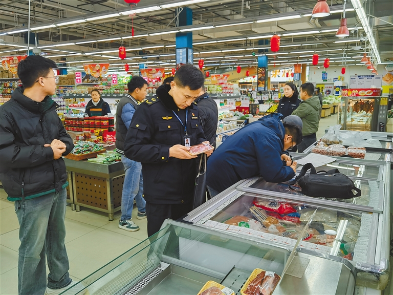 图为执法人员在商超开展肉制品检查。本报记者 央金 摄