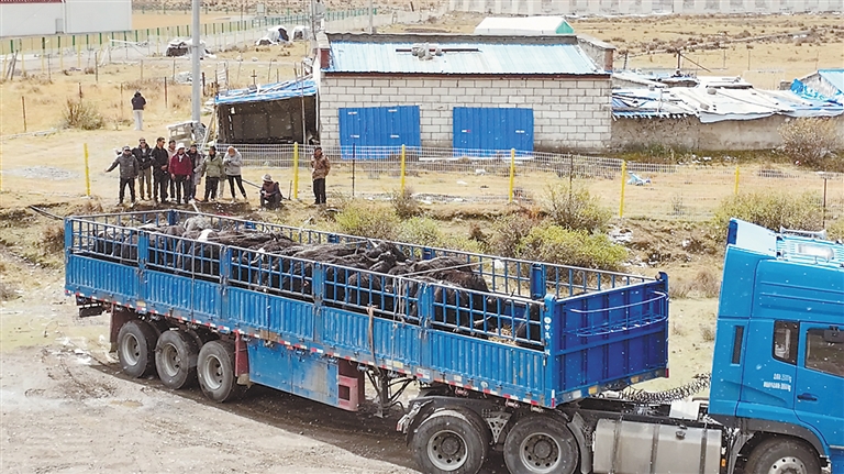 图为边坝县从嘉黎县娘亚公司批量运输娘亚牦牛良种。
