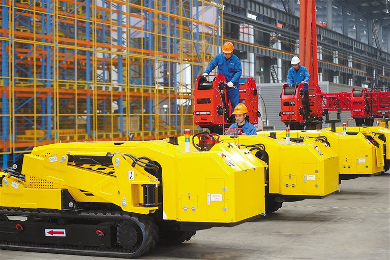 图为12月12日,在位于浙江省湖州市德清县雷甸镇的浙江省建设工程机械集团有限公司德清精益智能工厂,工人在赶制履带式轻型组塔装置产品。新华社发(谢尚国 摄)