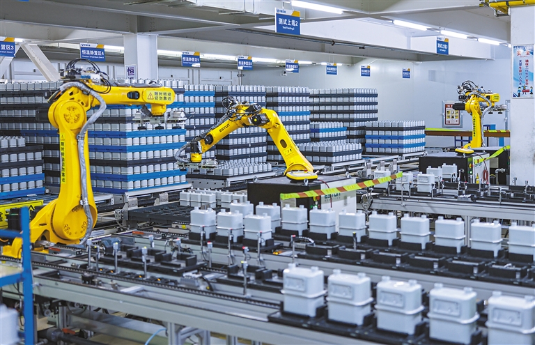 图为12月12日,在山东省荣成市一家燃气计量仪表制造企业的智能化生产车间内,智能机器人在进行生产作业。新华社发(李信君 摄)
