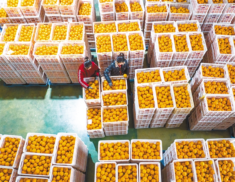 图为12月12日,工人在湖北省秭归县辰颐物语华中秭归电商物流产业园鲜橙包装车间忙碌(无人机照片)。新华社发(王罡 摄)