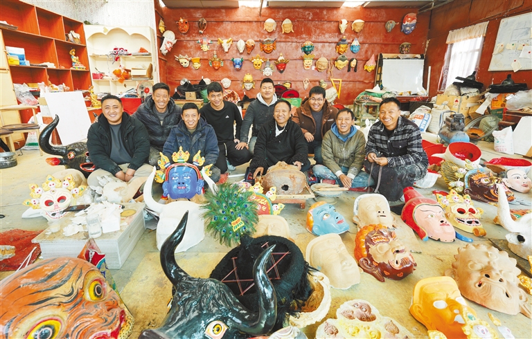 在拉萨市达孜区雪乡民间传统手工艺农民专业合作社的小院里,拉萨布制面具制作技艺西藏自治区级非遗传承人西洛和徒弟们忙得热火朝天,他们正在制作面具。面具制作工序繁杂,制作一个面具包括雕刻、分层、风干和喷漆等十几道工序。 2012年,在政府的扶持下,西洛创办了传统手工艺合作社,主要制作和销售藏戏面具。西洛制作的面具造型精美,广泛运用于藏戏表演中。“面具的价格从几百元到几万元不等,大部分订单来自西藏的各大藏戏团。”西洛说。近年来,合作社不断吸纳当地群众学习面具制作技艺,不仅为当地群众提供就业机会,也进一步助力非物质文化遗产的保护和发展。 合作社的工匠们在工作间合影。新华社记者 丁汀 摄