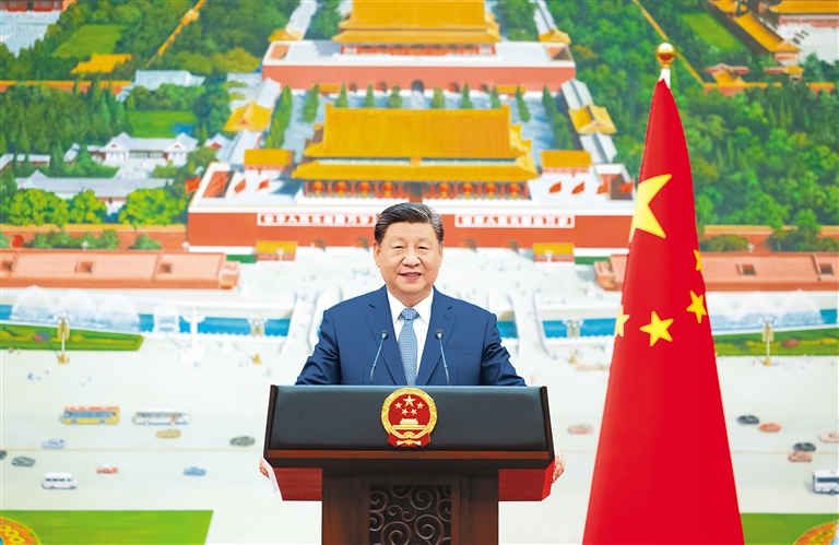 习近平强调,我们所处的时代面临地缘冲突、单边行径、保护主义上升以及气候变化等重大挑战和危机,亟须各国共同采取行动。站在新的历史十字路口,各国更应该从人类历史中吸取经验教训,加强团结协作,为维护世界和平和发展凝聚更大合力。作为国际社会的稳定、积极、进步力量,中国将始终坚定不移走和平发展道路,同各国一道,倡导平等有序的世界多极化、普惠包容的经济全球化,践行全人类共同价值,推动构建人类命运共同体。