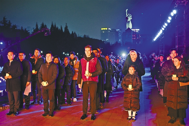 12月13日是第十一个南京大屠杀死难者国家公祭日。入夜,各界人士在侵华日军南京大屠杀遇难同胞纪念馆集会,为南京大屠杀死难者举行“烛光祭”,寄托哀思,祈愿和平。 图为12月13日,人们手持蜡烛参加活动。新华社记者 季春鹏 摄