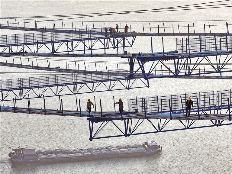 近日,在燕矶长江大桥的猫道面网铺设施工现场,建筑工人在距离江面近200米的高空作业,伴着脚下的长江波涛,稳步推进工程建设。