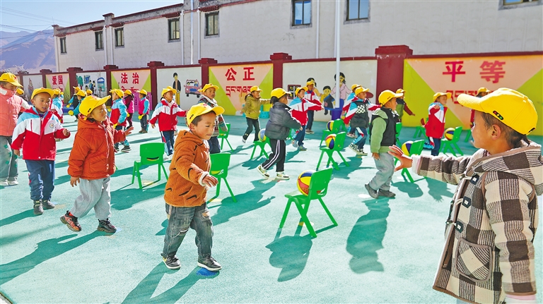 图为南木林县多角乡中心小学内学生们在进行户外活动。