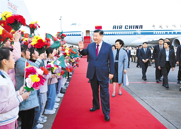 16时许,习近平乘坐的专机徐徐降落在澳门国际机场。习近平和夫人彭丽媛走出舱门,向欢迎人群挥手致意。澳门警察乐队奏响热情洋溢的欢迎曲,舞龙舞狮表演喜气欢腾。舷梯旁,两名少年儿童向习近平和彭丽媛献上鲜花。在澳门特别行政区行政长官贺一诚和夫人郑素贞陪同下,习近平和彭丽媛同前来迎接的人员亲切握手。数百名澳门青少年和各界群众代表挥动国旗、特别行政区区旗和鲜花,表达热烈的欢迎。
