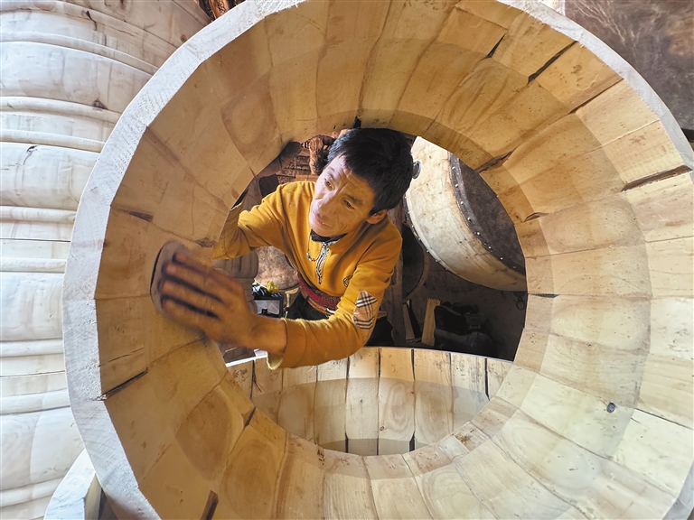 图为罗布扎西在制作藏式皮鼓。 本报记者 次仁平措 摄