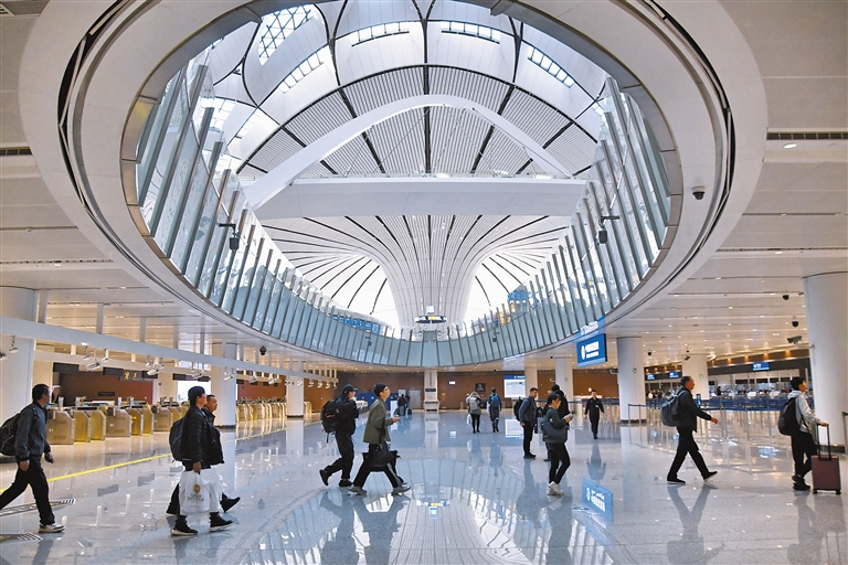 图为外国游客在北京大兴机场边检大厅准备入境。
